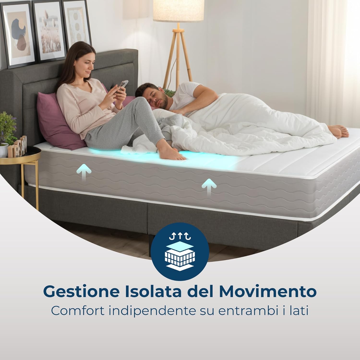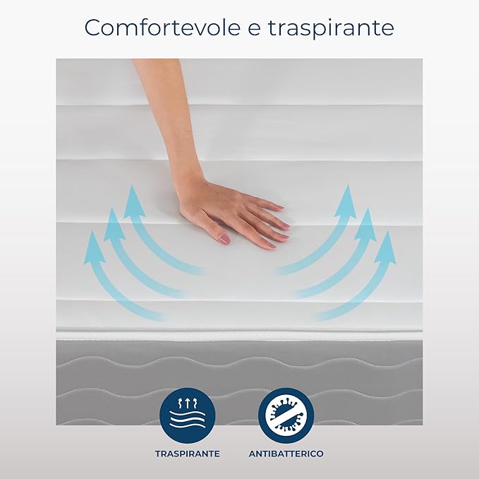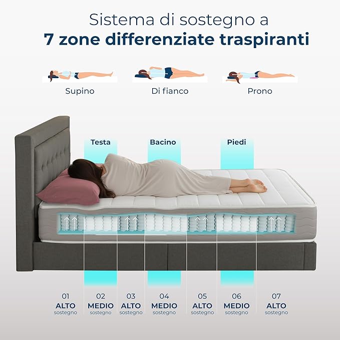 Materasso alto 22 cm a molle insacchettate con 7 zone differenziate per un sostegno ergonomico che aiuta a trattare dolori cervicali e mal di schiena. Si adatta ai movimenti del corpo e garantisce accoglienza e comfort, inoltre il rivestimento esterno è fresco, traspirante e antibatterico.