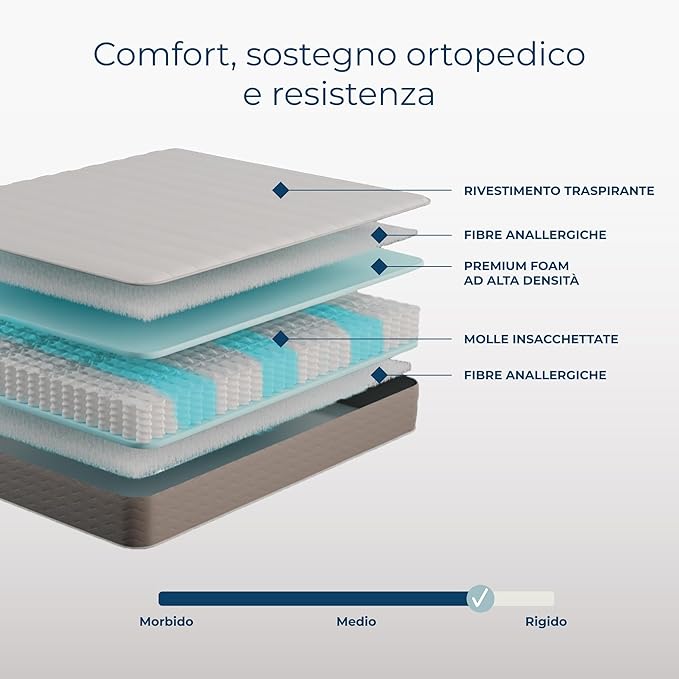 Il Foam ad Alta Densità è soffice e avvolgente; le fibre anallergiche sono fresche e leggere, perfette per i periodi più caldi.
