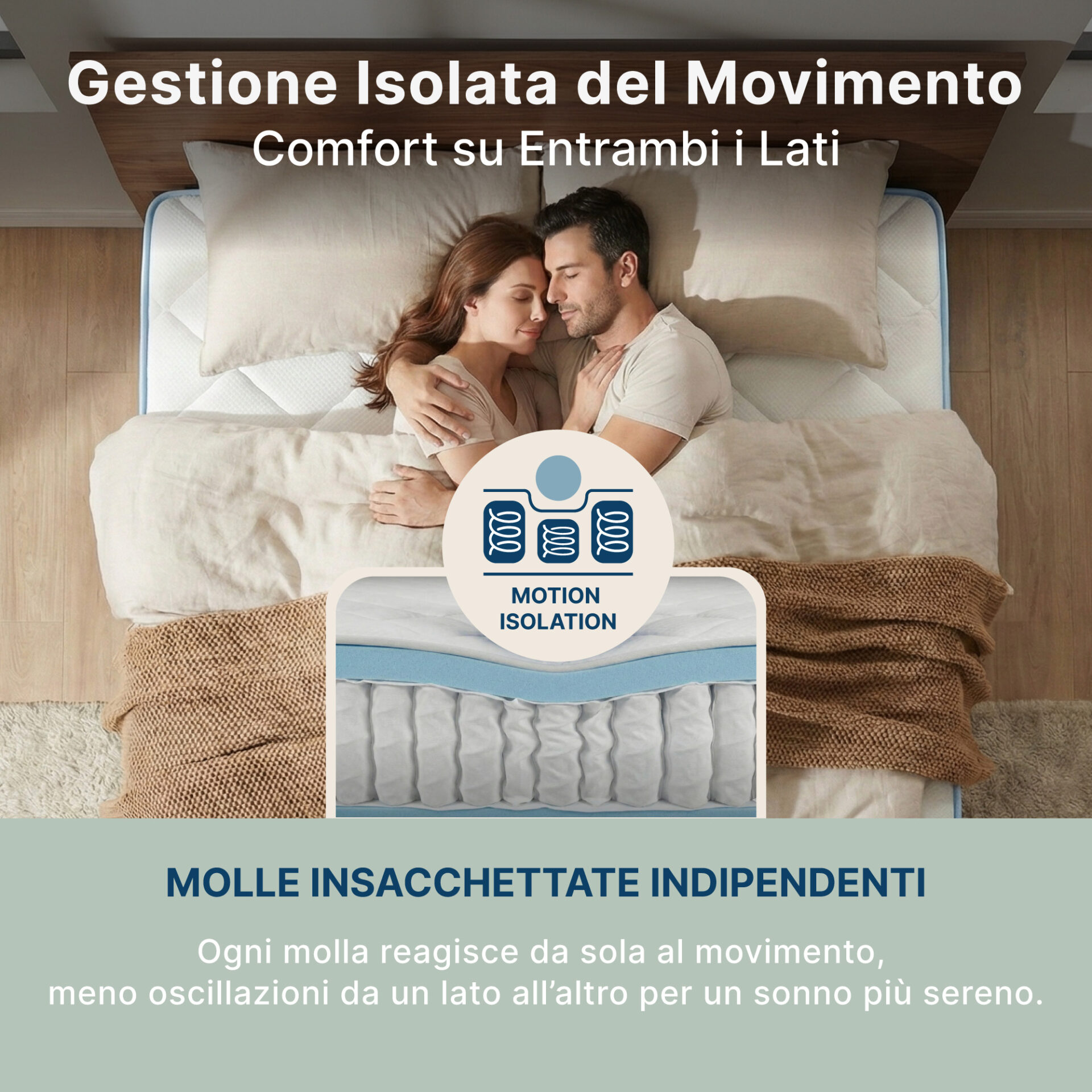 Realizzato con un’anima interna di 18 cm di molle insacchettate e uno strato di soffice Memory Lite. Questa struttura assicura un supporto medio-rigido che mantiene la colonna vertebrale perfettamente allineata, rendendolo la scelta ideale per chi dorme di lato o di schiena su una rete a doghe standard.
