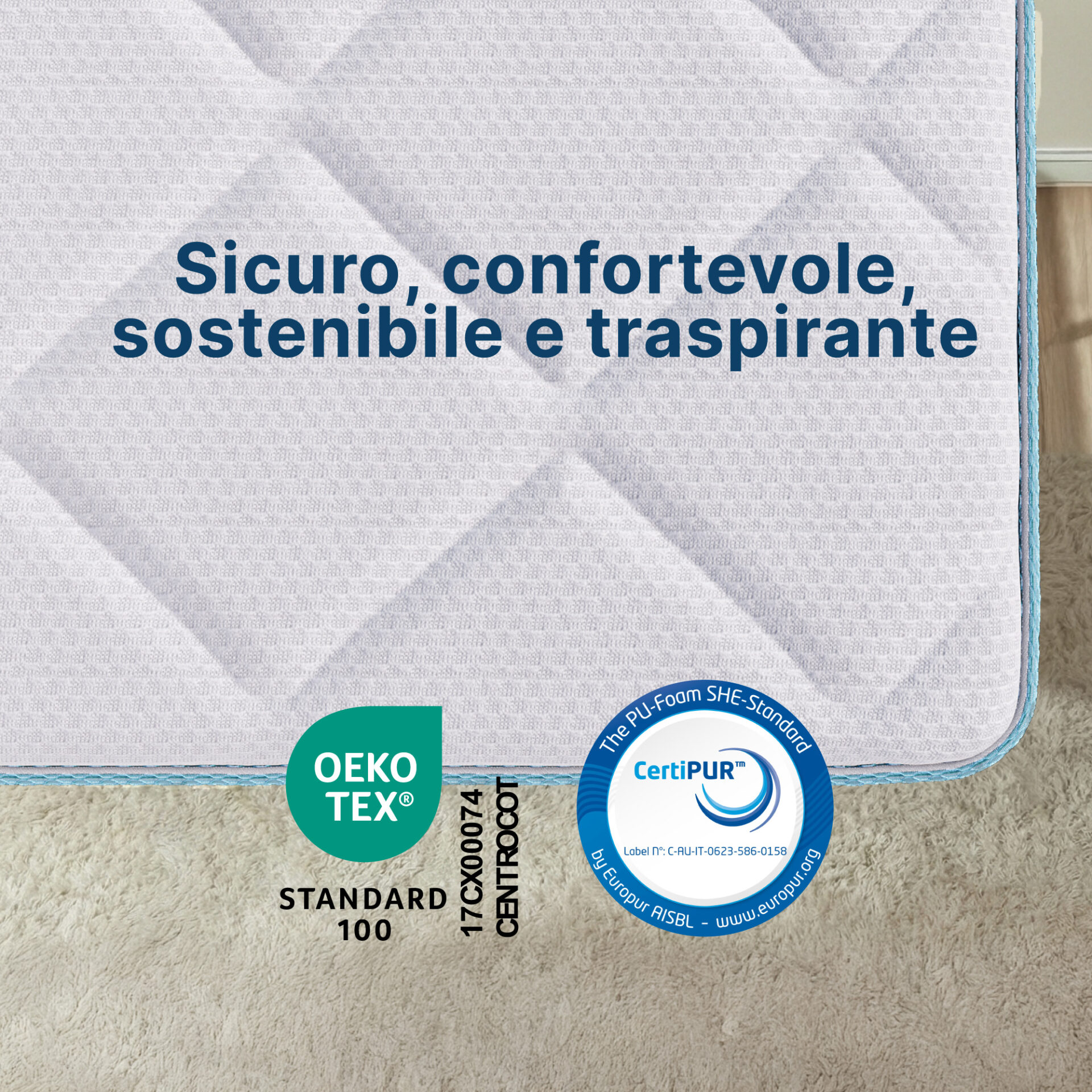 I materassi Sleephome sono certificati OEKO-TEX Standard 100 e Certi-Pur: tutti i materiali sono sicuri per l’uomo e per l’ambiente, i foam utilizzati sono testati e privi di sostanze nocive o allergiche.